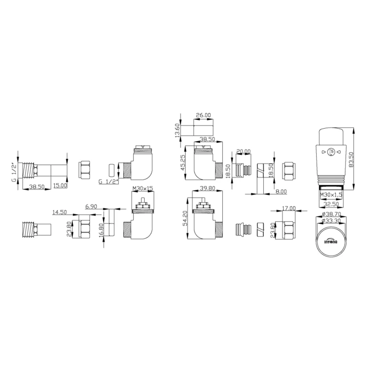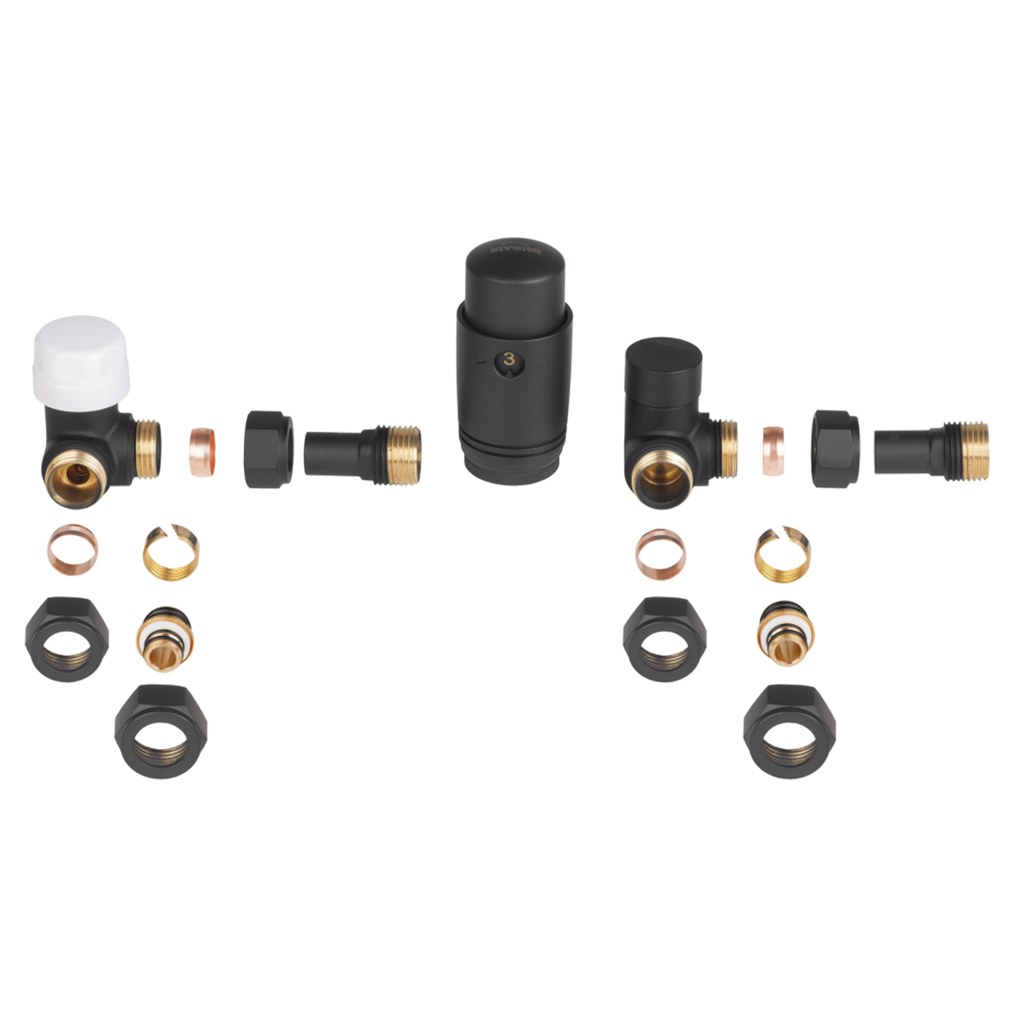 Praktiskt axiellt termostatset för anslutning av bad­rums­radiatorer till koppar- (15 mm) eller PEX-installationer (16 mm).