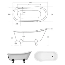 Badkar Royal Elegance Grafit Blank 160 cm med Vit Lejonfötter & Badavlopp