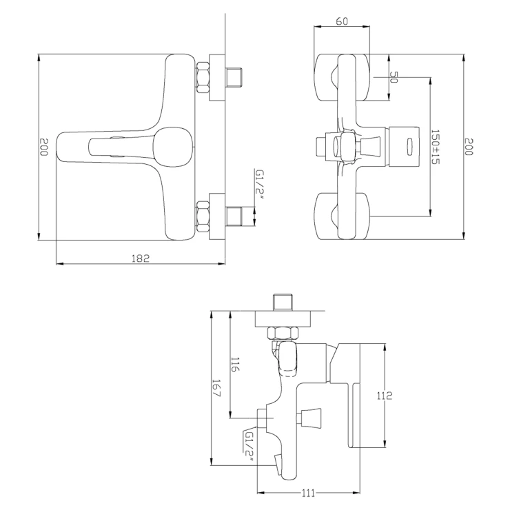 Stilren väggmonterad badkarsblandare med enkelgrepp för smidig kontroll av temperatur och vattenflöde.