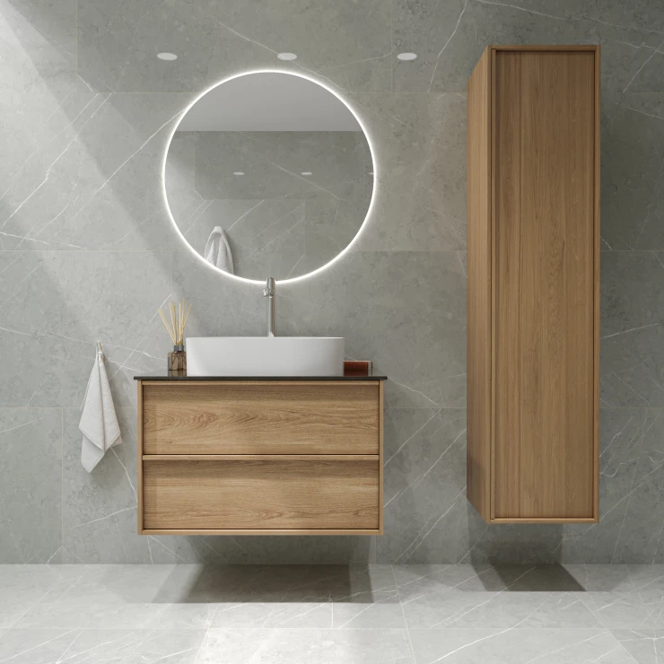 Badrumspaket Ekskär Ek 80 cm med Cosentino Brun Bänkskiva, Högskåp, Spegel, Handfat, Tvättställsblandare & Bottenventil