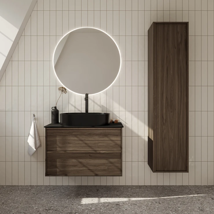 Badrumspaket Ekskär Valnöt 80 cm med Cosentino Svart Bänkskiva, Högskåp, Spegel, Handfat, Tvättställsblandare & Bottenventil
