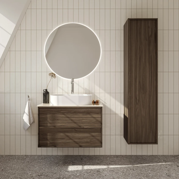 Badrumspaket Ekskär Valnöt 80 cm med Cosentino Ljusbeige Bänkskiva, Högskåp, Spegel, Handfat, Tvättställsblandare & Bottenventil