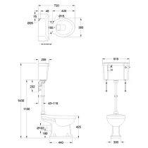 • -Mått på: toalett - 660 x 360 x 450mm, cistern - 205 x 515 x 330mm, medelnivå flush pipe - 105 x 220 x 703mm, toalettsits - 395 x 348 mm.