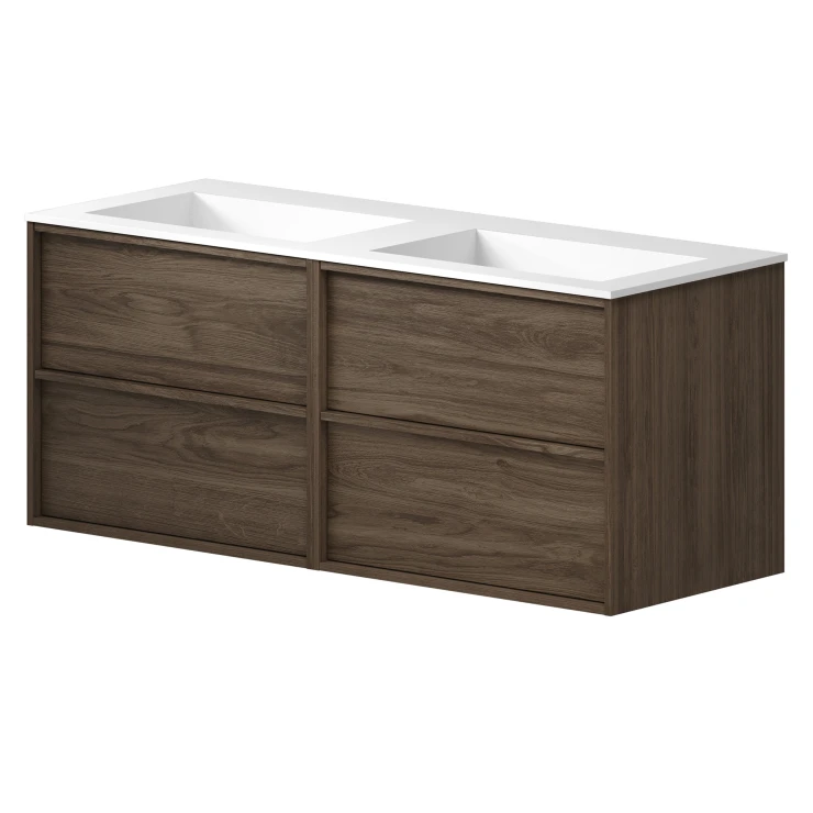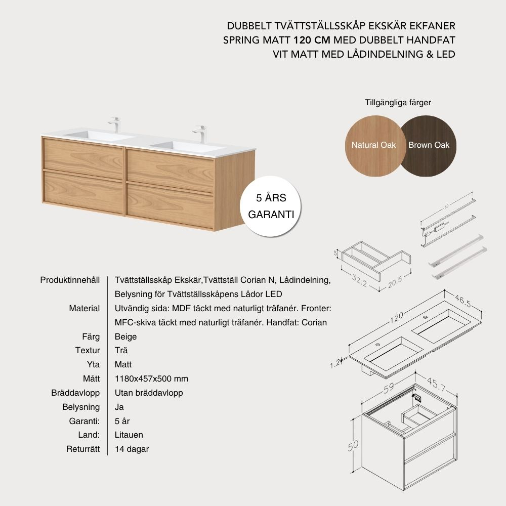 Dubbelt Tvättställsskåp Ekskär Valnöt Matt 120 cm med Corian Dubbelt Handfat med Lådindelning & LED