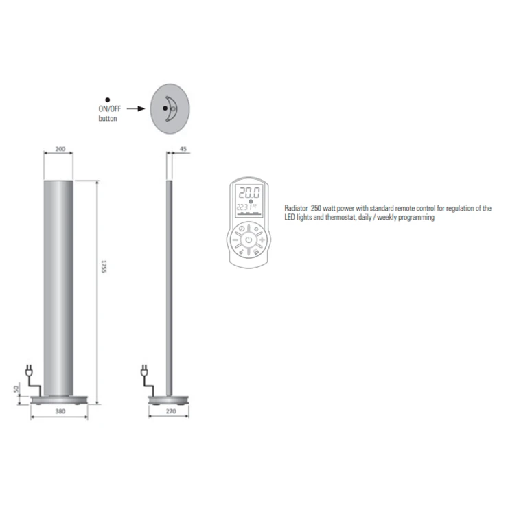 Radiator med 250 W effekt, utrustad med standard-fjärrkontroll för styrning av både LED-belysning och termostat. Inkluderar daglig och veckovis programmering för maximal komfort och energieffektivitet.