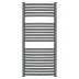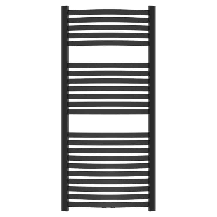 Modern bad­rums­radiator i stål med universella anslutningar: botten mitt (D50 – 50 mm) och botten axiell (500 mm).