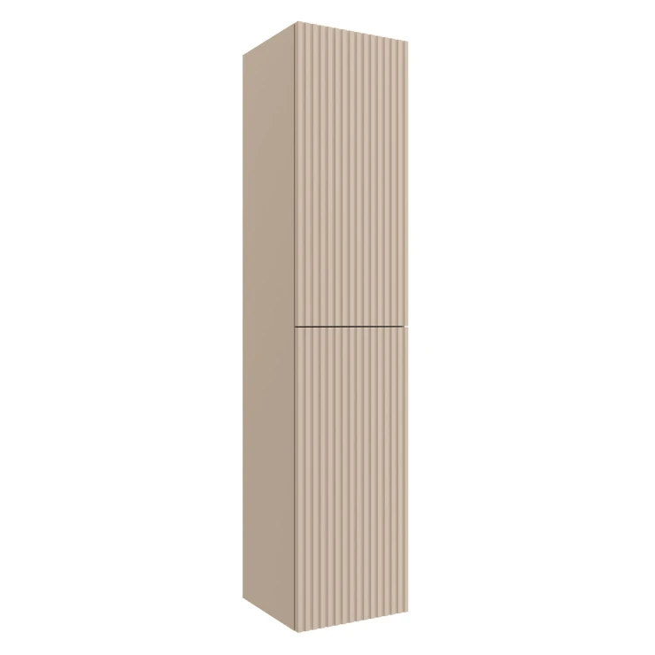 Det har samma karaktäristiska vertikalt spårfrästa fronter och färger som tvättställsskåpen, vilket skapar en harmonisk och enhetlig helhet.