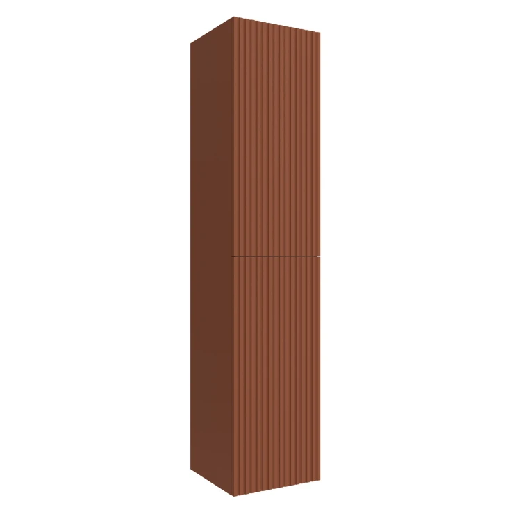 Det har samma karaktäristiska vertikalt spårfrästa fronter och färger som tvättställsskåpen, vilket skapar en harmonisk och enhetlig helhet.