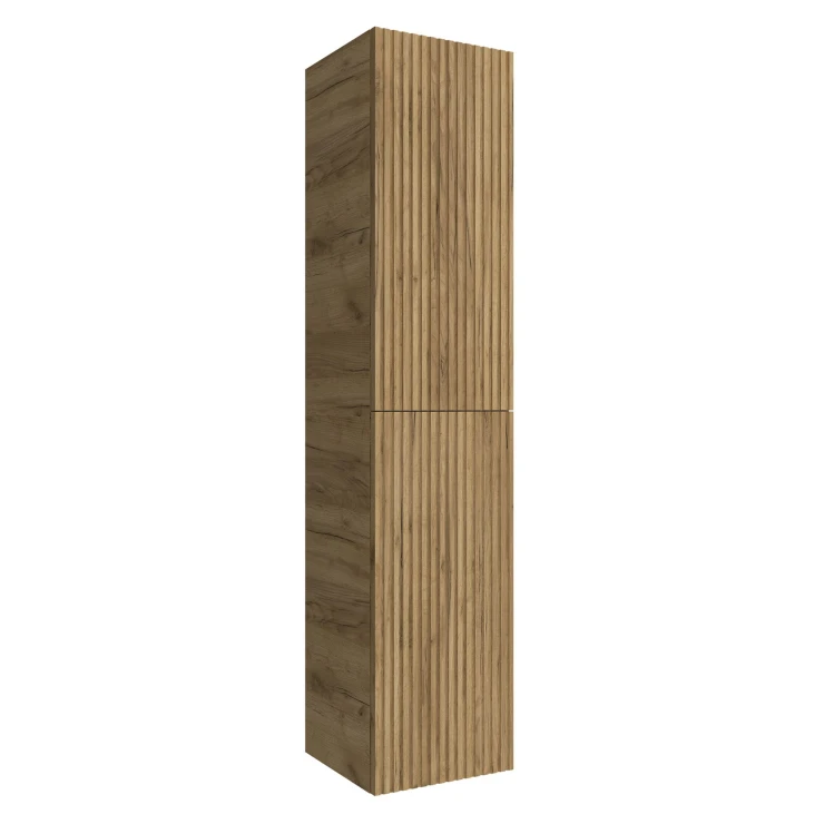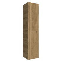 Det har samma karaktäristiska vertikalt spårfrästa fronter och färger som tvättställsskåpen, vilket skapar en harmonisk och enhetlig helhet.