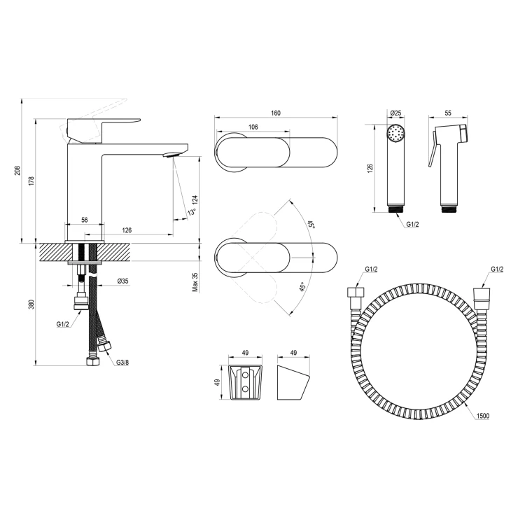 Design: med manuell bidédusch med envägsventil