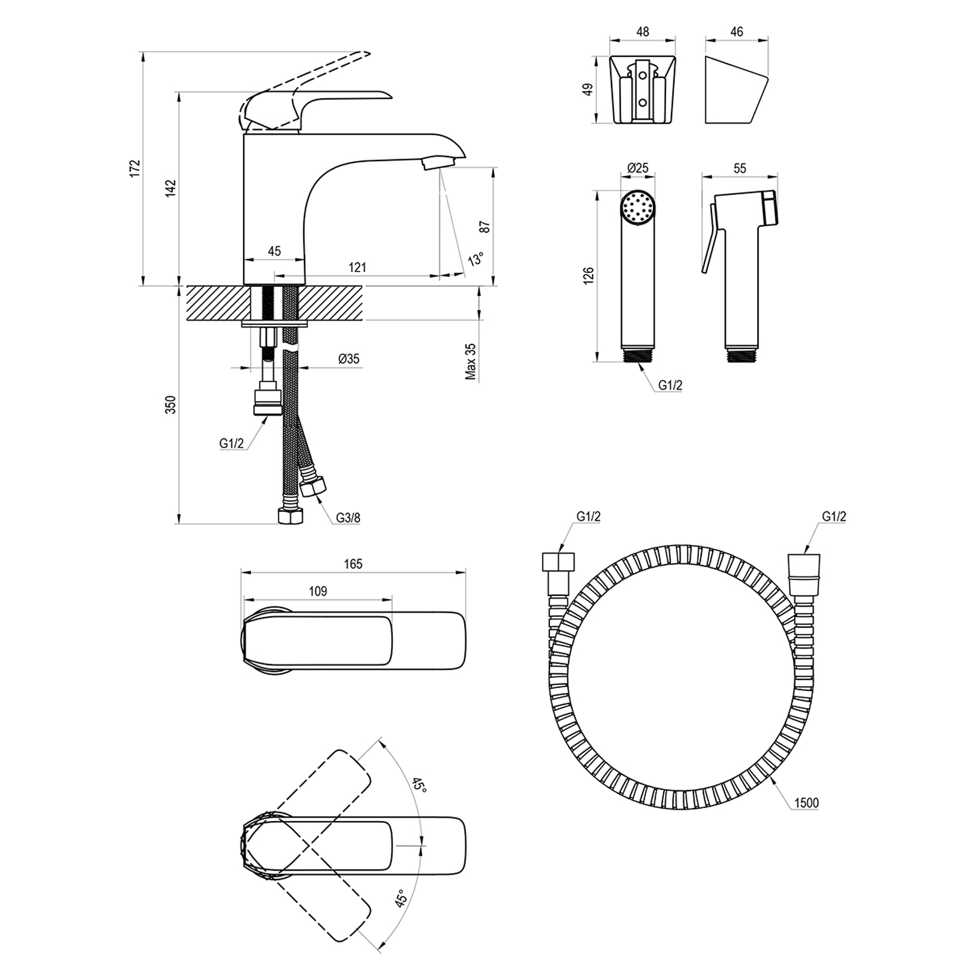 Flat tvättställsblandare med bidédusch