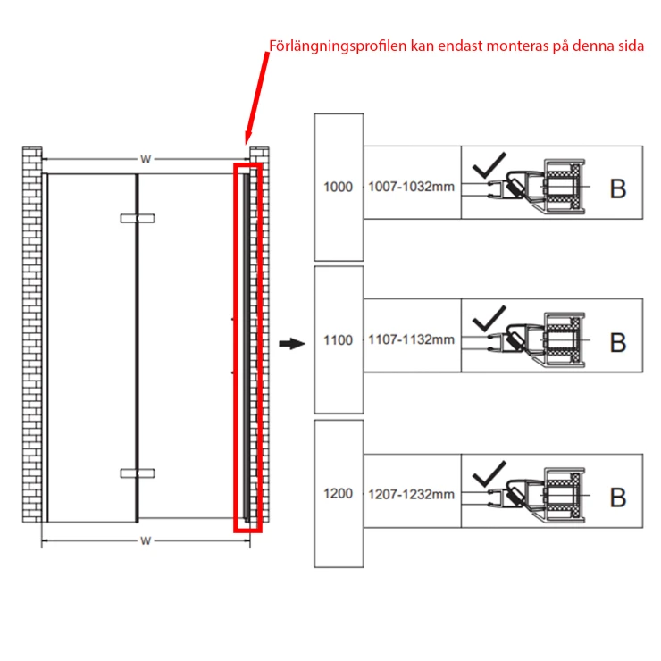 - Förlängning av nischduschdörr: med 2,5 cm på magnetsidan