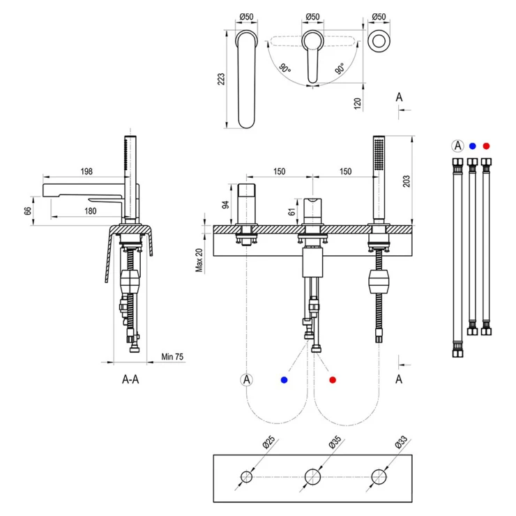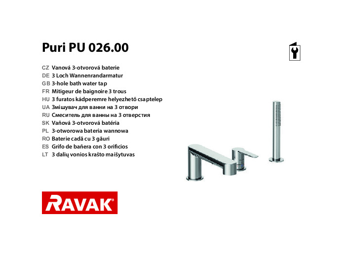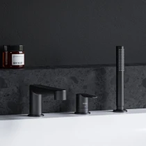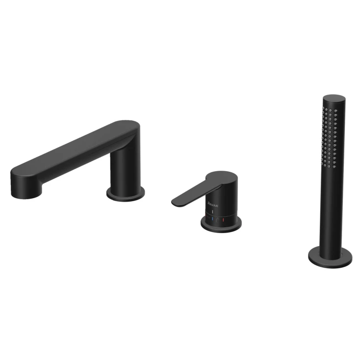 Puri badkarsblandare för däckmontering, trehåls, med vridomkastare och duschset.