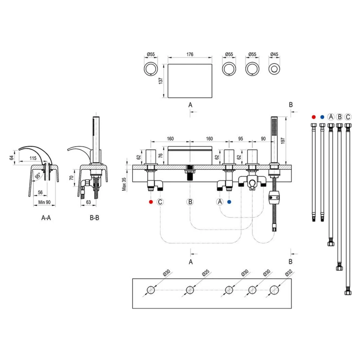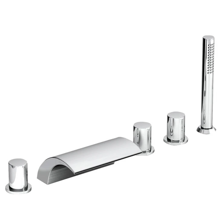 Chrome badkarsblandare för däckmontering, fyrhåls, med duschset.