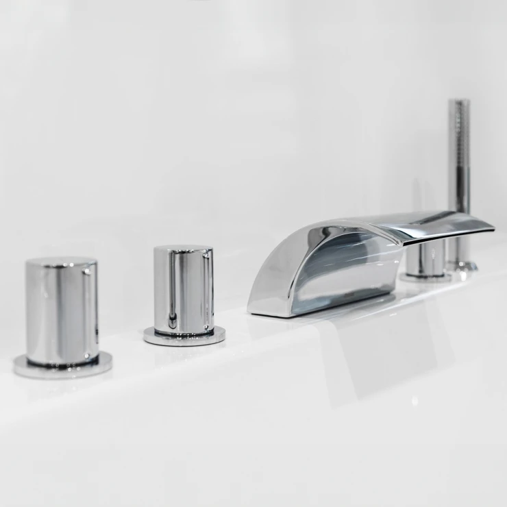 Chrome vattenfallsblandare för däckmontering installeras på badkar med tillräcklig bredd och plan kant.