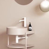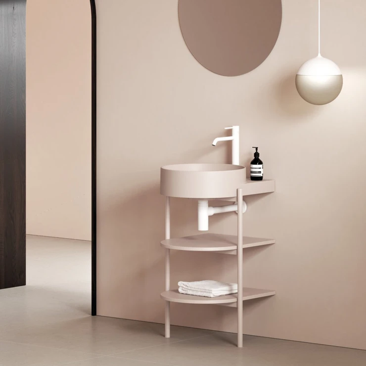 Tack vare de väl avvägda proportionerna känns hyllsystemet på stålben inte skrymmande och ger samtidigt gott om förvaring för badrumsartiklar.