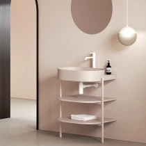 Tack vare de väl avvägda proportionerna känns hyllsystemet på stålben inte skrymmande och ger samtidigt gott om förvaring för badrumsartiklar.