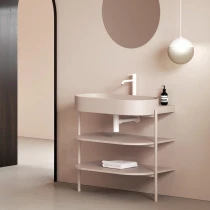 Tack vare de väl avvägda proportionerna känns hyllsystemet på stålben inte skrymmande och ger samtidigt gott om förvaring för badrumsartiklar.