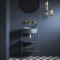 Den öppna Yard-möbeln består av en stabil metallram och två hyllplan. Den fristående metallstrukturen med hyllor CS Yard 40 är specifikt designad för Yard 40-tvättstället. Strukturen är utrustad med ett hål för vattenlåset samt stabiliserande fötter. Hyllorna följer perfekt tvättställets form och erbjuder gott om förvaringsutrymme. Produkten måste säkras mot väggen. Levereras omonterad.