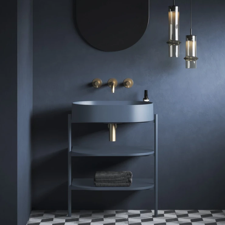 Tack vare de väl avvägda proportionerna känns hyllsystemet på stålben inte skrymmande och ger samtidigt gott om förvaring för badrumsartiklar.