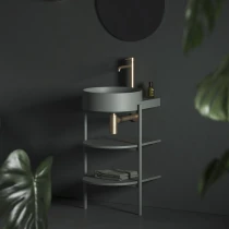 Den öppna Yard-möbeln består av en stabil metallram och två hyllplan. Den fristående metallstrukturen med hyllor CS Yard 40 är specifikt designad för Yard 40-tvättstället. Strukturen är utrustad med ett hål för vattenlåset samt stabiliserande fötter. Hyllorna följer perfekt tvättställets form och erbjuder gott om förvaringsutrymme. Produkten måste säkras mot väggen. Levereras omonterad.