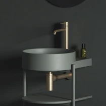 Tack vare de väl avvägda proportionerna känns hyllsystemet på stålben inte skrymmande och ger samtidigt gott om förvaring för badrumsartiklar.