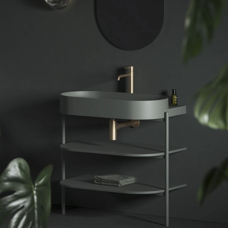 Tack vare de väl avvägda proportionerna känns hyllsystemet på stålben inte skrymmande och ger samtidigt gott om förvaring för badrumsartiklar.