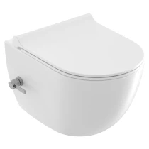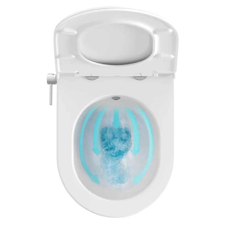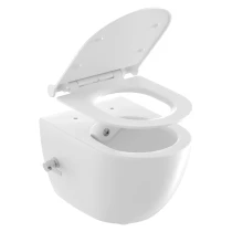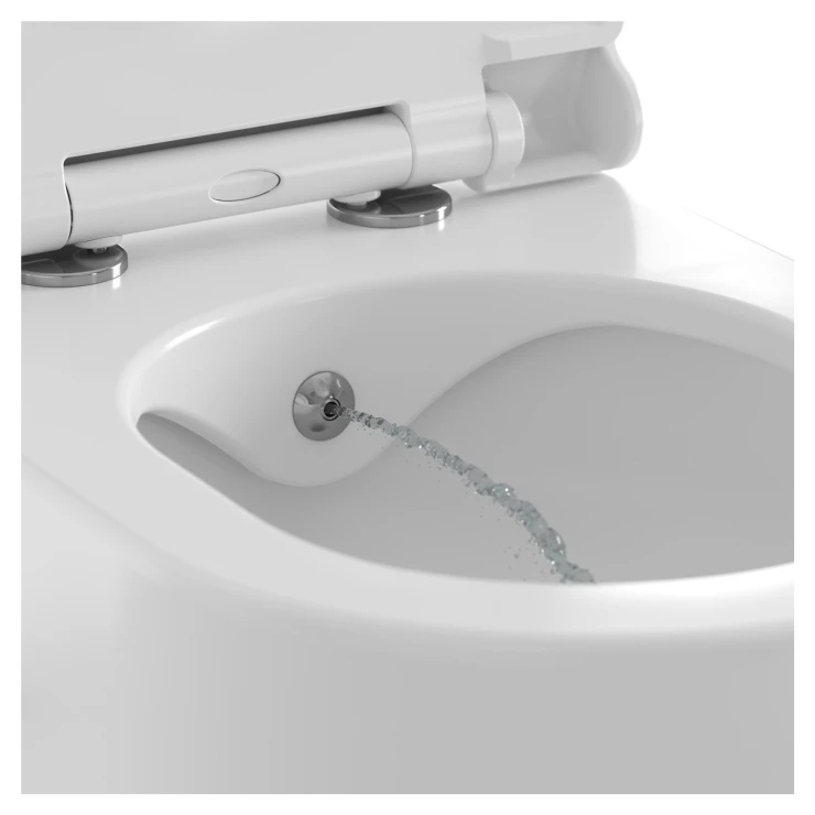 Det inbyggda bidémunstycket i skålen skjuts inte ut, men är justerbart för att ställa in den optimala vinkeln på vattenstrålen. Strålens intensitet och vattentemperaturen styrs med en spakblandare placerad på toalettens högra sida. Ingen elanslutning krävs.