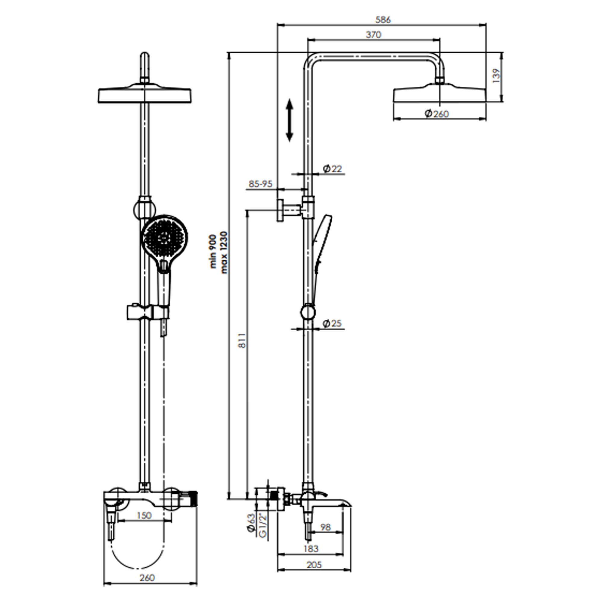 Mått: 260x586x900-1230mm