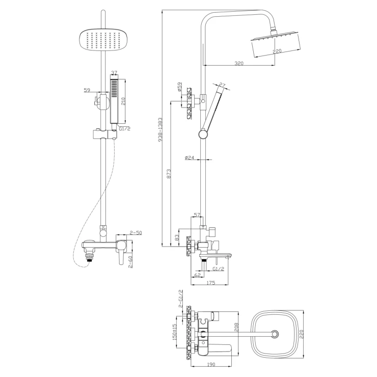 Duschkolumn med Badkarsblandare – Justerbar Höjd 94–138 cm