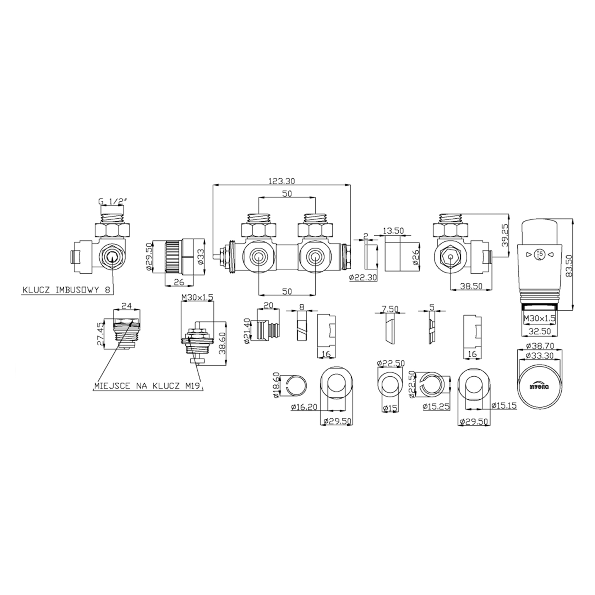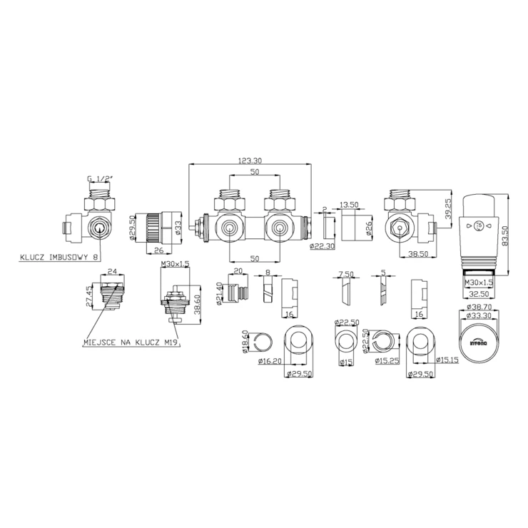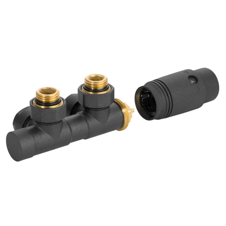 Praktiskt DUOPLEX-term­ostatset för anslutning av bad­rums­radiatorer med anslutnings­avstånd på 50 mm till installationer i koppar (15 mm) eller PEX (16 mm).