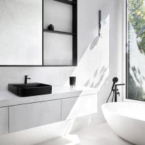 Granitkomposit är en kombination av kvartsand och hartser i perfekta proportioner. Tack vare detta är våra tvättställ inte bara motståndskraftiga mot stötar, utan också mot hög temperatur (250 °C), missfärgning och termisk chock. De absorberar inte lukt och har hydrofoba egenskaper som stöter bort vattenpartiklar. Granitkomposit är elegant och tidlös och tack vare ett brett utbud av färger harmoniserar det med varje badrumsinredning, både klassisk och modern.