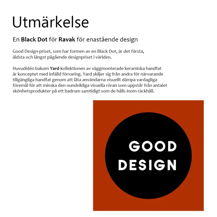 Företagets engagemang för kvalitet och design har belönats med flera internationella utmärkelser, inklusive Red Dot, iF Design Award och Good Design. Detta gör Ravak till ett tryggt och inspirerande val för både privatpersoner och professionella inom bygg- och inredningsbranschen som vill skapa badrum där man gärna startar dagen med en uppfriskande dusch och avslutar den med avkoppling i ett varmt bad.