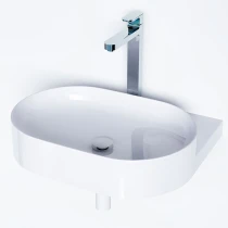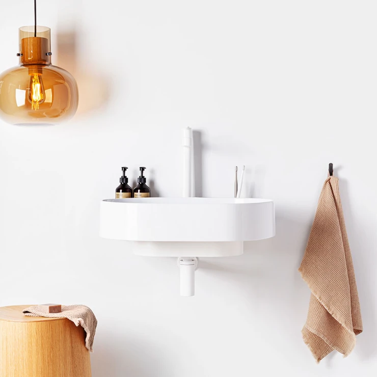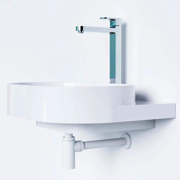 • -Stabilt stöd, inga möbler behövs: Yard installeras direkt på väggen med en stålkonsol, vilket eliminerar behovet av ytterligare möbler. Konsolen matchar tvättställets form och förbättrar helhetsintrycket.