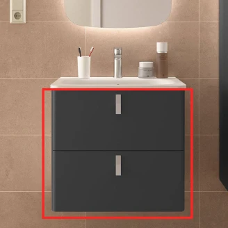 Kollektionen finns i tre varianter av tvättställsskåp: 60 cm med två lådor, 90 cm med dörr till höger samt 90 cm med dörr till vänster.