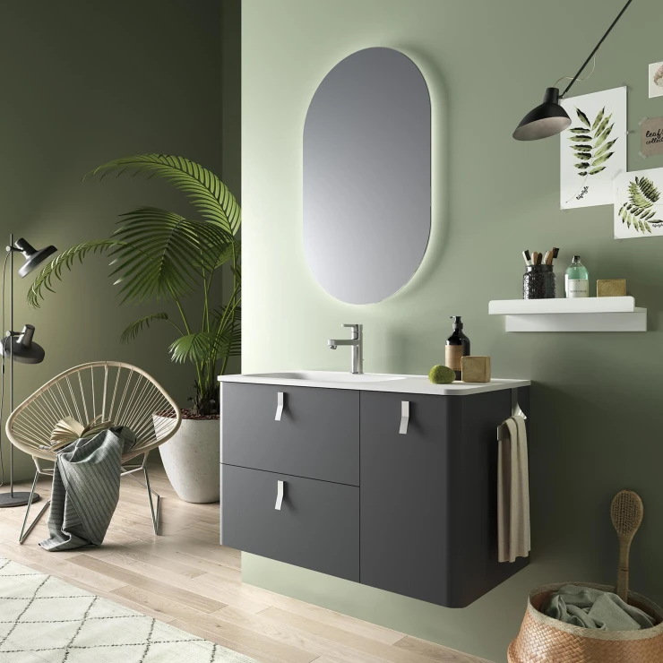 Kollektionen finns i tre varianter av tvättställsskåp: 60 cm med två lådor, 90 cm med dörr till höger samt 90 cm med dörr till vänster.