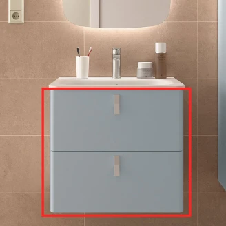 Kollektionen finns i tre varianter av tvättställsskåp: 60 cm med två lådor, 90 cm med dörr till höger samt 90 cm med dörr till vänster.