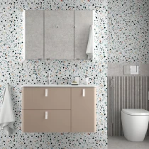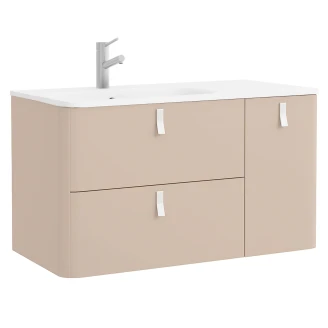 Kollektionen finns i tre varianter av tvättställsskåp: 60 cm med två lådor, 90 cm med dörr till höger samt 90 cm med dörr till vänster.
