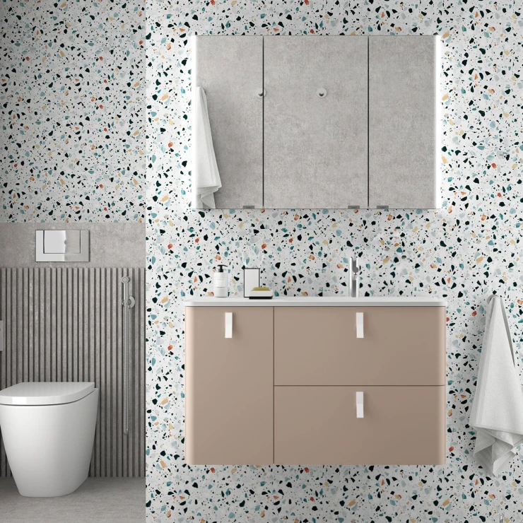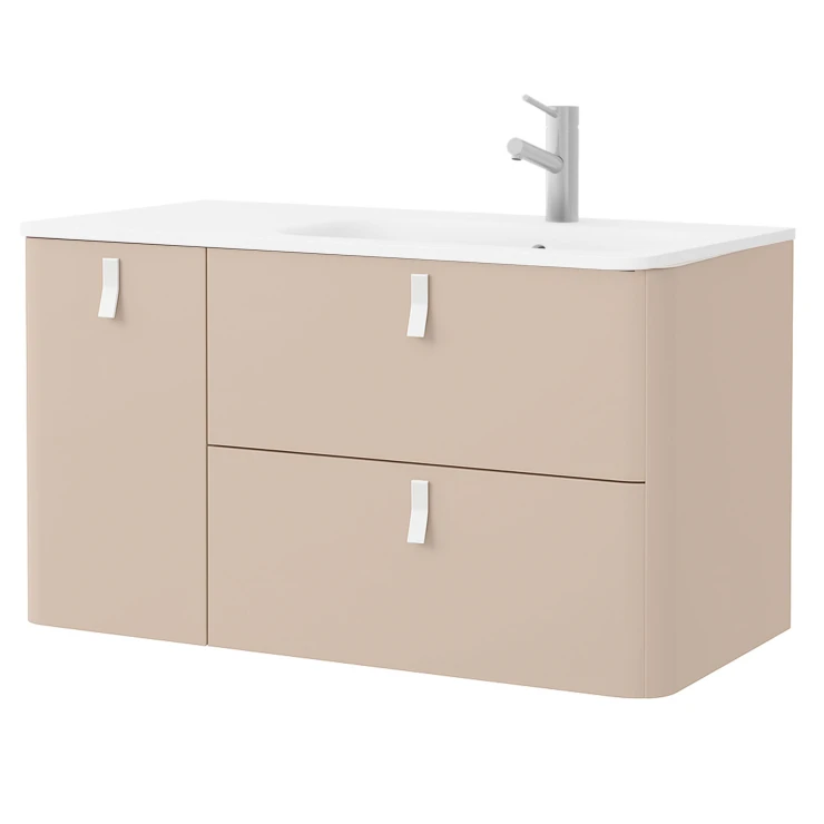 Kollektionen finns i tre varianter av tvättställsskåp: 60 cm med två lådor, 90 cm med dörr till höger samt 90 cm med dörr till vänster.