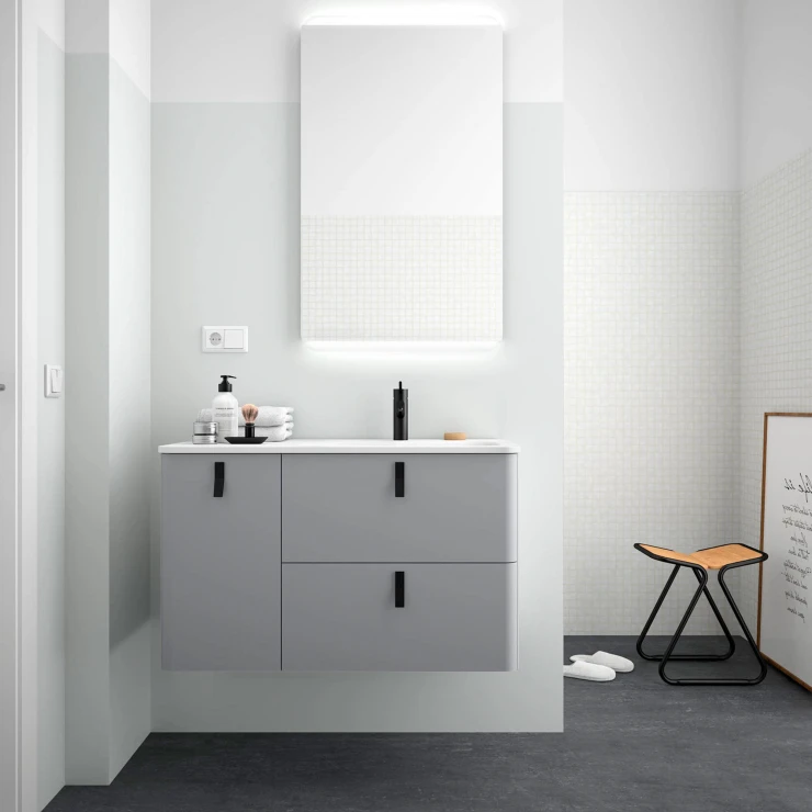 Kollektionen finns i tre varianter av tvättställsskåp: 60 cm med två lådor, 90 cm med dörr till höger samt 90 cm med dörr till vänster.