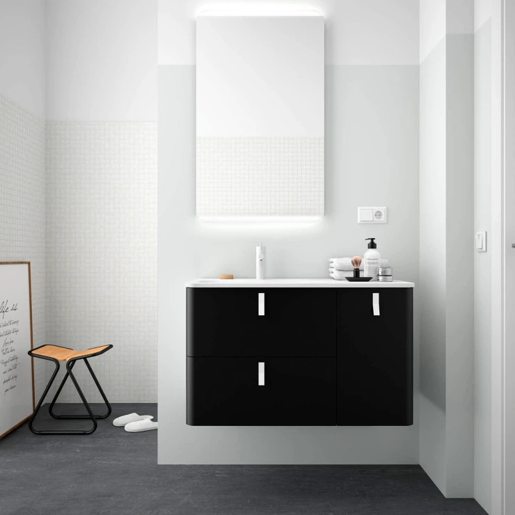 Kollektionen finns i tre varianter av tvättställsskåp: 60 cm med två lådor, 90 cm med dörr till höger samt 90 cm med dörr till vänster.
