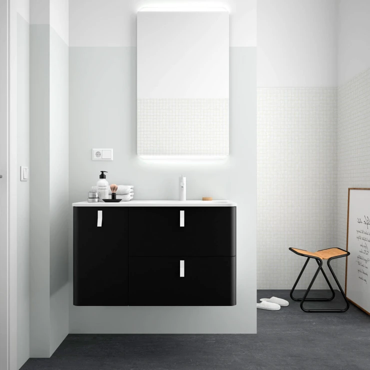 Kollektionen finns i tre varianter av tvättställsskåp: 60 cm med två lådor, 90 cm med dörr till höger samt 90 cm med dörr till vänster.