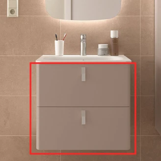 Kollektionen finns i tre varianter av tvättställsskåp: 60 cm med två lådor, 90 cm med dörr till höger samt 90 cm med dörr till vänster.
