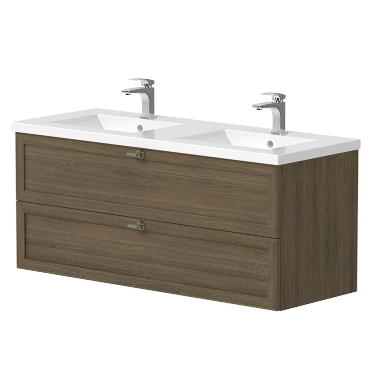 Tvättställsskåp Craftwood Valnöt Matt 120 cm med Dubbelt Handfat Vit Blank & Handtagen Antik Mässing