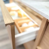 Njut av de integrerade ergonomiska handtagen av naturlig ek och gott om förvaring för dina saker i den rymliga handfatsenhetens lådor.