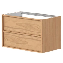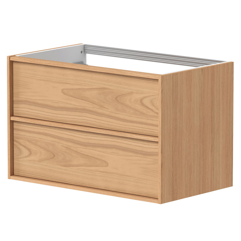 Njut av de integrerade ergonomiska handtagen av naturlig ek och gott om förvaring för dina saker i den rymliga handfatsenhetens lådor.