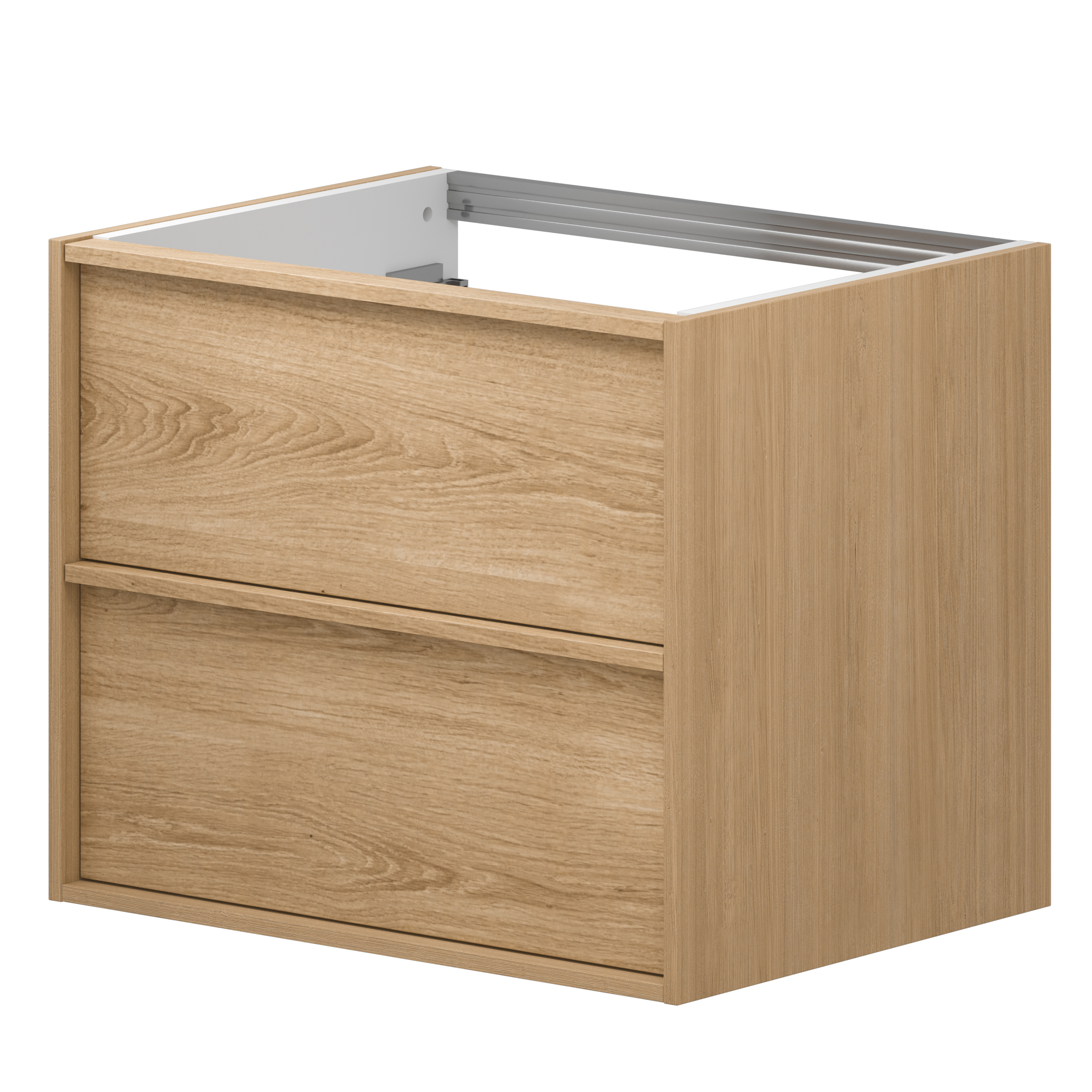 Njut av de integrerade ergonomiska handtagen av naturlig ek och gott om förvaring för dina saker i den rymliga handfatsenhetens lådor.