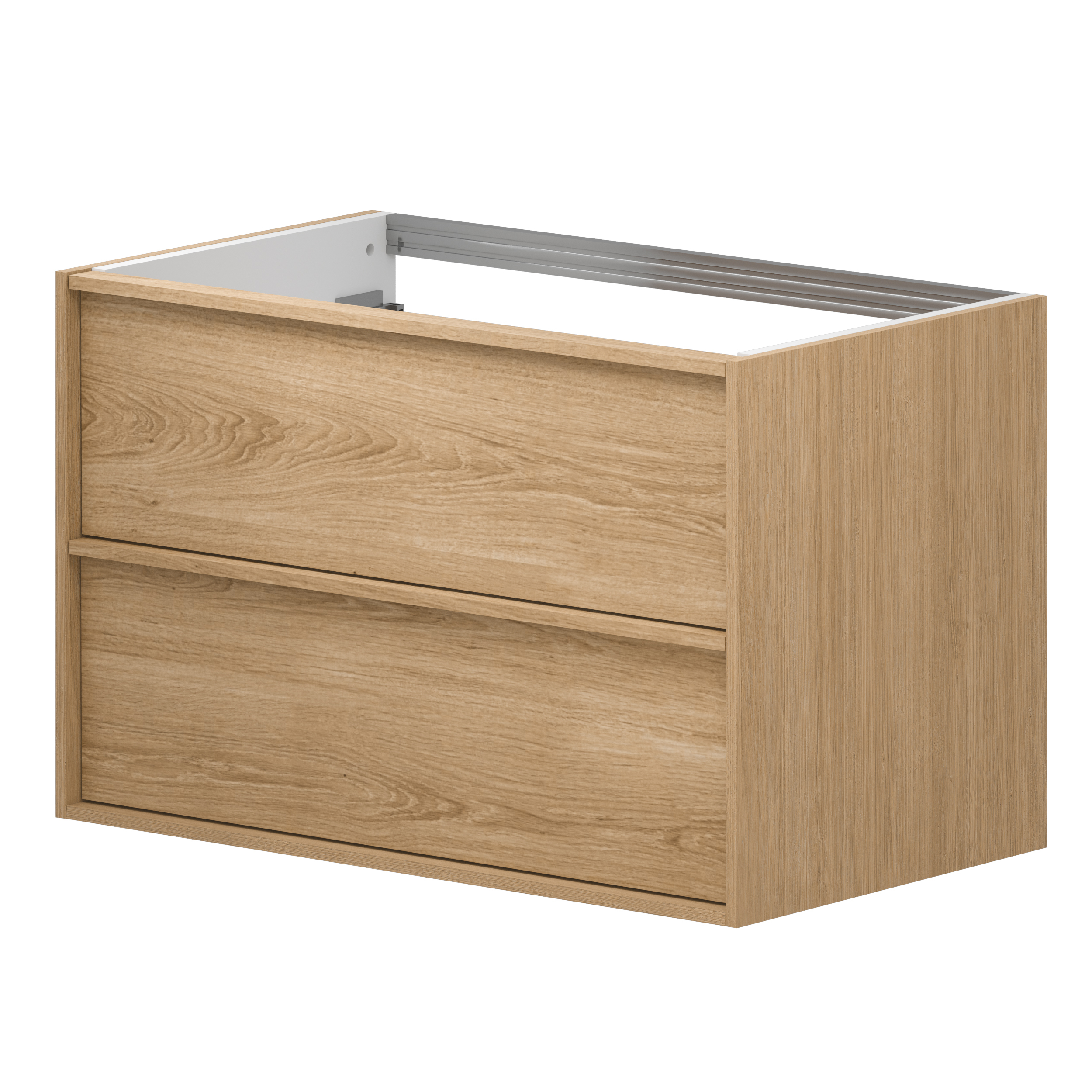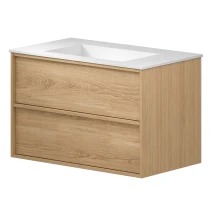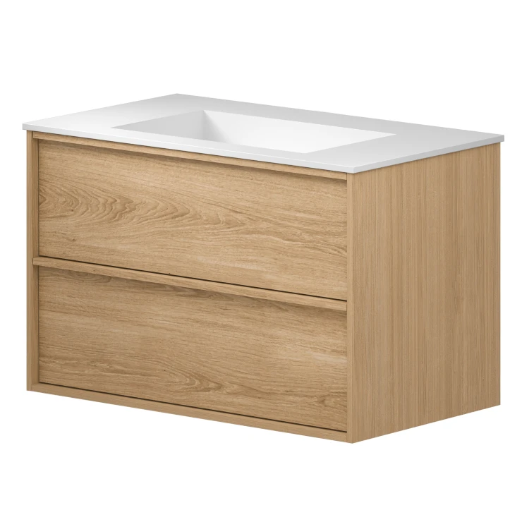 Njut av de integrerade ergonomiska handtagen av naturlig ek och gott om förvaring för dina saker i den rymliga handfatsenhetens lådor.