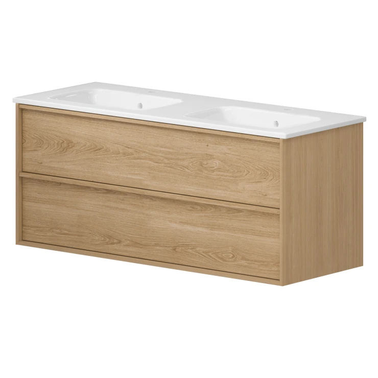 Njut av de integrerade ergonomiska handtagen av naturlig ek och gott om förvaring för dina saker i den rymliga handfatsenhetens lådor.