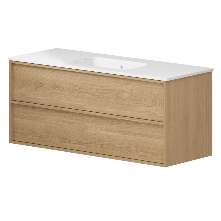 Njut av de integrerade ergonomiska handtagen av naturlig ek och gott om förvaring för dina saker i den rymliga handfatsenhetens lådor.